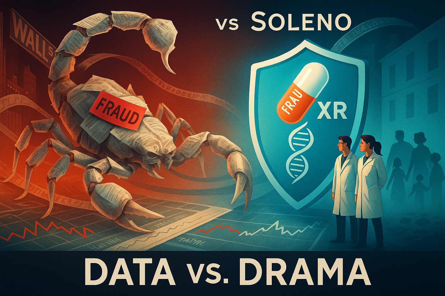 In its Aug. 15, 2025 report, Scorpion alleged that Vykat XR carries serious safety risks and could even face market withdrawal, while also questioning the integrity of Soleno’s clinical evidence and publications (including claims of red flags around trial data and physician-authored papers); the disclosure of Scorpion’s short sent SLNO down ~8–13% on the day and triggered multiple plaintiff-firm probes, and shares fell a further ~12–14% on Sept. 10 after Soleno later disclosed a patient death.